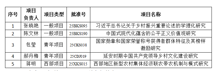 1.张晓艳、陈文林 获批2025年度国家社科基金一般项目;包莹、郝丹梅 获批2025年度国家社科基金青年项目;蒋明 获批2025年度国家社科基金西部项目