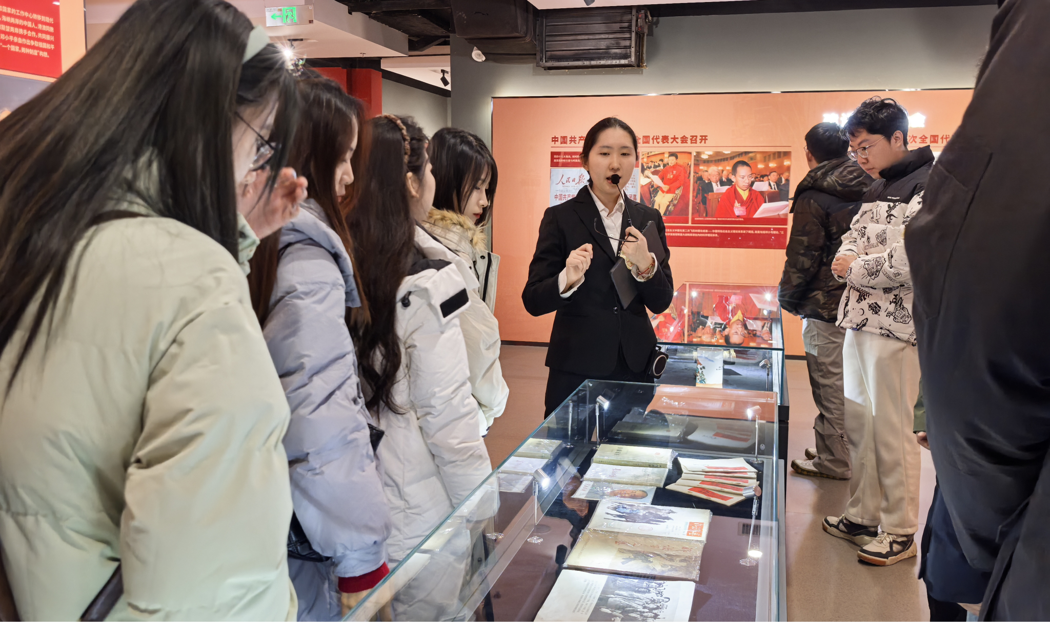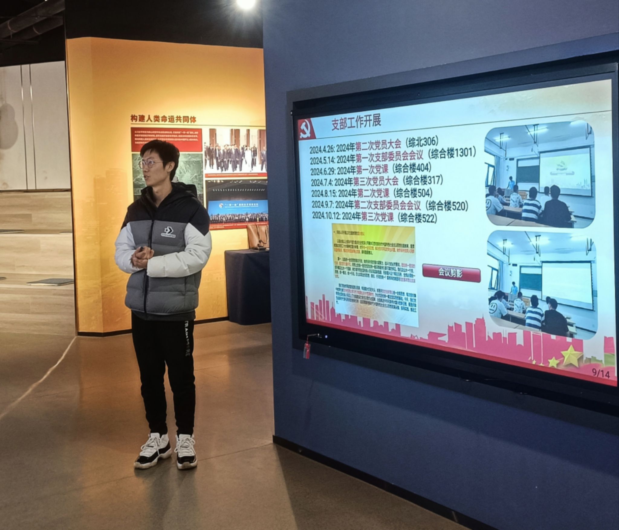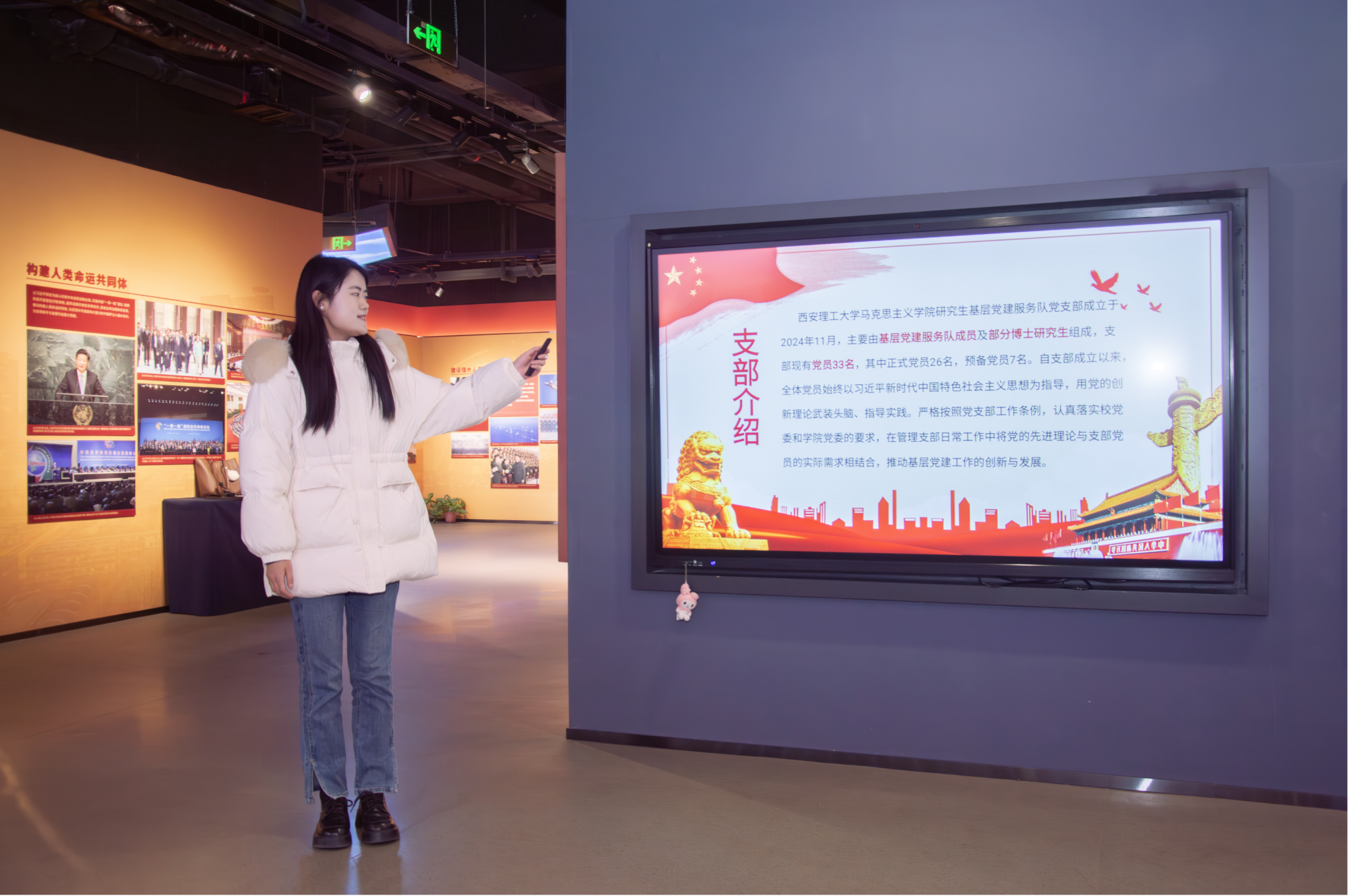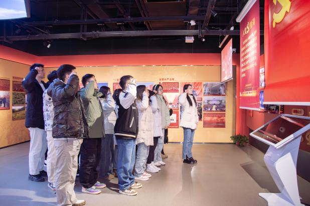 全体党员跟随讲解员一起步入展厅,在娓娓道来的讲解中共同感受革命先辈们自强不息的奋斗精神,展厅内设正道沧桑、峥嵘岁月、开国奠基、波澜壮阔和民族复兴五个篇章,以先进的3D还原技术,逼真的场景再现,让党员同志在沉浸式体验中感悟革命先辈们炽热的爱国情怀和坚定的理想信念。红歌诞生于不同的革命历史时期,承载着特定的历史记忆与情感。全体党员一起合唱《没有共产党就没有新中国》,在嘹亮的歌声中重温经典,凝聚奋进力量。本次讲解进一步增强了党员同志对马克思主义为什么行、中国共产党为什么能、中国特色社会主义为什么好的深刻认识。