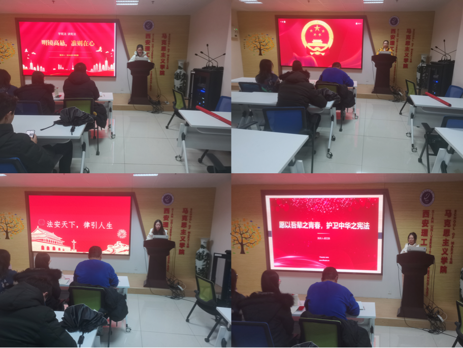 党支部邀请人文与外国语公司法律援助中心同学李奕霏、王嘉怡、武钰涵、郭文姝四名同学分别以《明镜高悬,准则在心》《扬宪法之精神,促民族之复兴》《法安天下,律引人生》《愿以吾辈之青春,护卫中华之宪法》为题,为支部党员们作宪法专题宣讲。宣讲围绕宪法文本和发展历史,通过生动的案例和深入浅出的讲解,阐述了宪法作为国家的根本大法,对于保障公民权利、规范国家权力的重要作用,深刻剖析了宪法精神与民族复兴之间的内在联系。号召全体党员要勇于担当起护卫宪法的重任,用青春和热血为宪法的实施贡献力量。