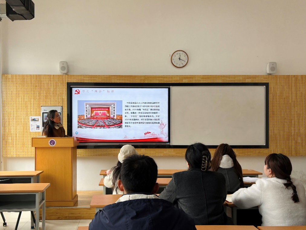 活动开始,由支部副书记李萌培为大家介绍了2025年全国两会召开的基本情况和重要意义。随后,大家共同学习了“两会”精神的相关材料,重点围绕政府工作报告中关于“高质量发展”“教育强国建设”“青年人才培养”等内容进行研讨。