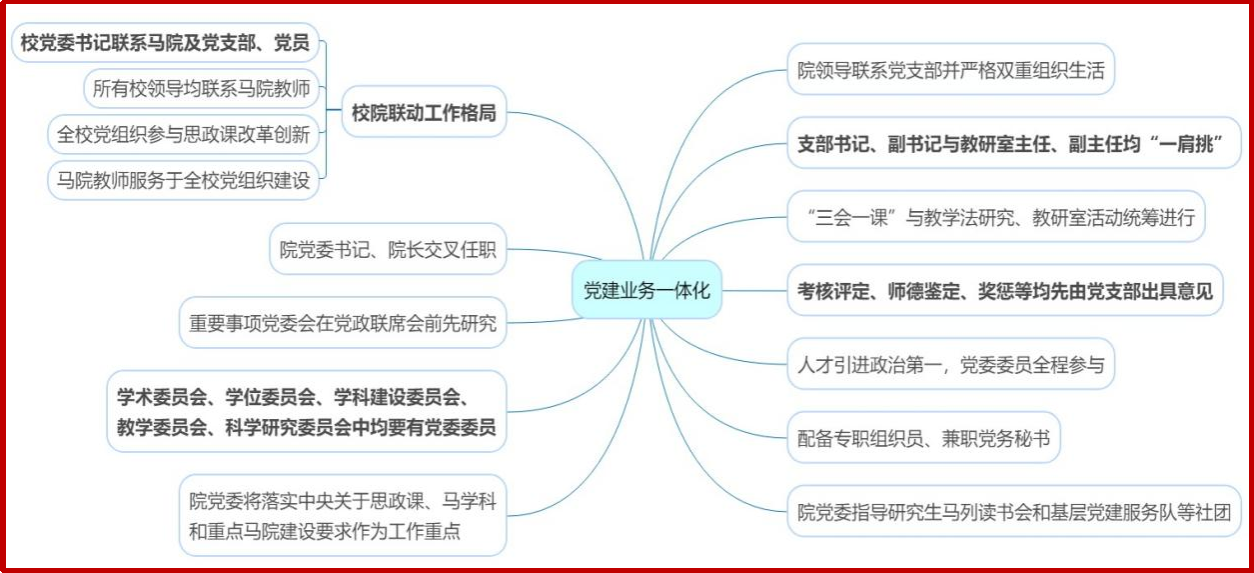 公司推进党建业务一体化发展机制。公司党委委员分别入选公司学术、学位、团队建设、教学委员会,党支部书记、副书记兼任教研室主任、副主任,实现党建与教学科研工作同部署、同落实、同考核,切实把全面加强党的领导落到实处。