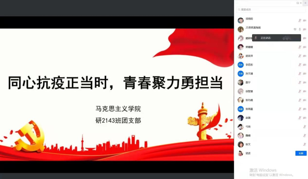 首先,团支书袁娟同学分别从抗疫精神的科学内涵、如何弘扬抗疫精神以及团员青年的责任与担当三个方面领学伟大抗疫精神的内涵实质,号召大家弘扬伟大抗疫精神,积极助力疫情防控工作,投身抗疫志愿服务;叮嘱大家在日常生活中做好防护、服从大局、认真完成线上学习的任务并养成良好的生活习惯。