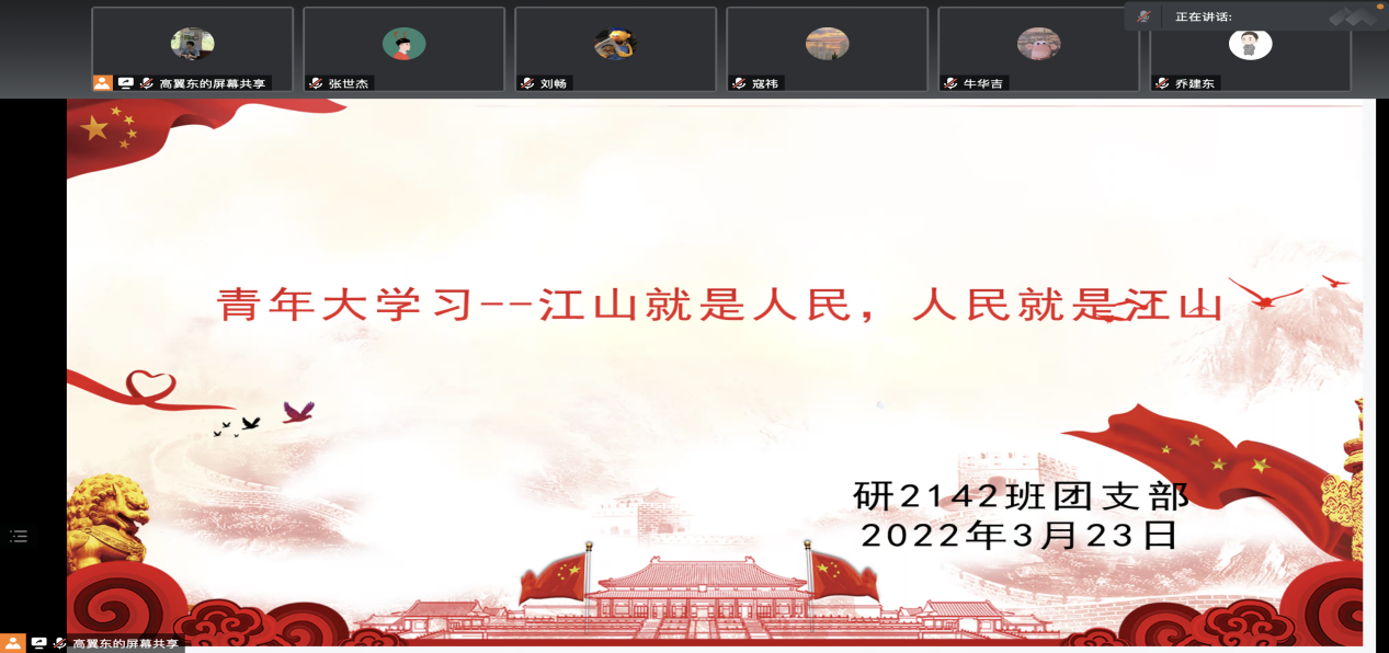 3月23日,sunbet研2142班团支部线上集中学习青年大学习关于“江山就是人民,人民就是江山”相关内容,回顾了习近平总书记在庆祝中国共产党成立100周年大会上的讲话和党的十九届六中全会精神,支部全体成员参与学习。