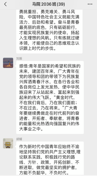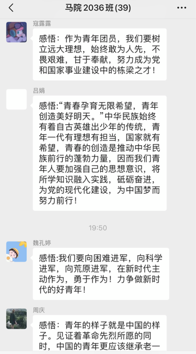 云团课观看结束之后,一些同学根据自己的学习感悟进行了分享发言。陈慧芬认为,在过去的一百年里,共青团坚定不移听党话、跟党走,发扬“党有号召、团有行动”的优良传统,为党争取青年人心,汇聚青年力量,在各个历史时期作出了积极贡献、发挥了重要作用。当代中国青年生逢盛世,肩负重任,身处中华民族发展的最好时期,把理想追求融入党和国家事业,方能不负韶华、不负时代、不负人民。