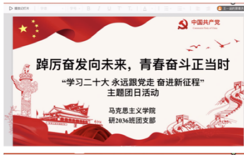 研2142班团支部以“立志做有理想、敢担当、能吃苦、肯奋斗的新时代好青年”为主题,从不同时代对于青年的要求、新时代内涵和实践路径三个部分进行主题学习和探讨。支部成员积极参加公司关于党的二十大精神的学习讲座和校院组织的“献礼二十大”系列活动,进行讨论,分享心得,一致表示要积极向在科技前沿、边关哨所、改革开放实践、抗疫一线、抗洪救灾现场的先进榜样学习,在今后要更加坚定理想信念,勤学各种本领,要从关于学术、成长、心态、社交、身体、生活这六个方面来践行作为研究生的使命担当。