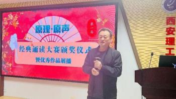 最后,原理教研室朱鸿亮主任做了总结点评,他高度赞扬了选手们的精彩表现,认为参赛队伍诵读的内容广泛,表现手段多样,创新元素丰富,表演感情充沛,让观众看到了新时代青年学子磅礴奋进力量和强烈使命担当。他最后鼓励同学们继续积极参加马克思主义经典著作的研读活动,厚植理论根基。