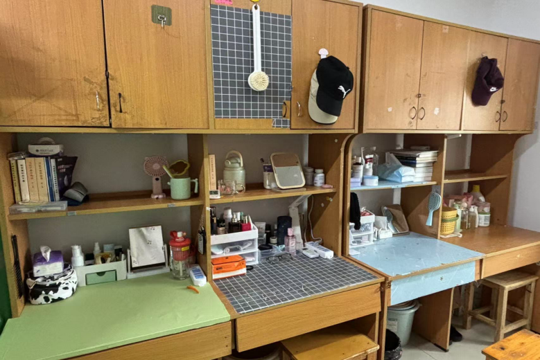 远眺,各个床帘仿佛是宿舍一块立体的卡通装饰画,以鲜明独特的色彩为宿舍空间注入生机活力。映入眼帘的是令人叹为观止的宿舍收纳系统,各种物品被巧妙地归类和存放,规整的收纳摆放让生活空间井然有序,宿舍一角充满了生活的气息和创意的火花。