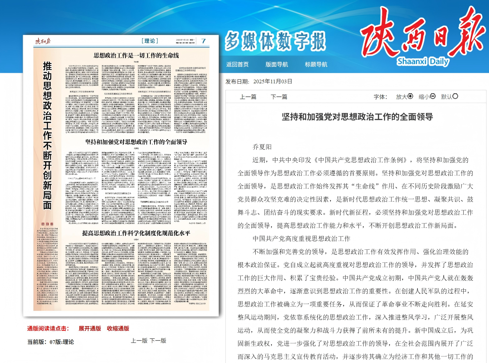 近期,中共中央印发《中国共产党思想政治工作条例》,将坚持和加强党的全面领导作为思想政治工作必须遵循的首要原则。坚持和加强党对思想政治工作的全面领导,是思想政治工作始终发挥其“生命线”作用、在不同历史阶段激励广大党员群众攻坚克难的决定性因素,是新时代思想政治工作统一思想、凝聚共识、鼓舞斗志、团结奋斗的现实要求。新时代新征程,必须坚持和加强党对思想政治工作的全面领导,提高思想政治工作能力和水平,不断开创思想政治工作新局面。